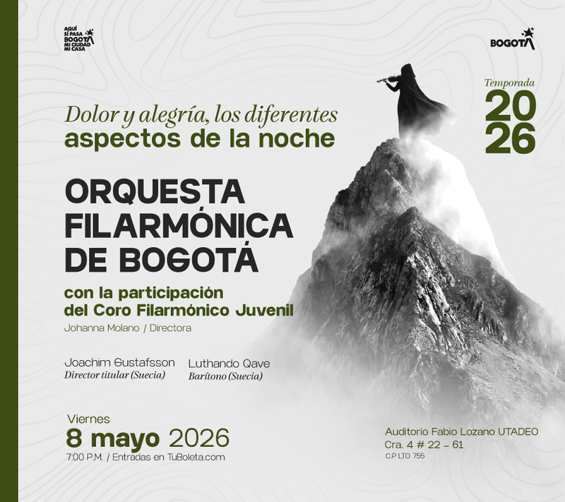 La Orquesta Sinfónica de la Facultad de Artes ASAB es el principal ensamble académico de la Universidad Distrital en Bogotá. Funciona como un laboratorio de formación profesional donde estudiantes y docentes interpretan un repertorio diverso que abarca desde los clásicos universales hasta composiciones contemporáneas y arreglos de música colombiana. Bajo la dirección de maestros como Jeisson Segura, la orquesta se ha consolidado como un referente de excelencia técnica y experimentación artística en la ciudad.A lo largo de su trayectoria, la agrupación ha destacado por su proyección cultural en escenarios de alto nivel y su participación en montajes operísticos de gran formato, como La Traviata y L'elisir d'amore. Más allá de la interpretación, su labor se centra en la investigación musical y el estreno de obras originales, integrando las secciones de cuerdas, maderas, metales y percusión en un espacio que conecta la academia con la escena profesional del país.Repertorio:Fantasía sobre motivos colombianos (Pedro Morales Pino)Obertura 1812 (P.I. Tchaikovsky)Al son del Bambú - Bambuco para Orquesta Sinfónica (Estreno - Michael Alvarez)Sinfonía N°8 en Sol Mayor (A. Dvorak)Hora: 6:00 pmDescuentos estudiantes, egresados tadeístas, o adulto mayor - Únicamente en la taquilla del Auditorio - miércoles a viernes de 12:00pm a 6:00pmEstudiante Tadeísta: Entrada libre -
