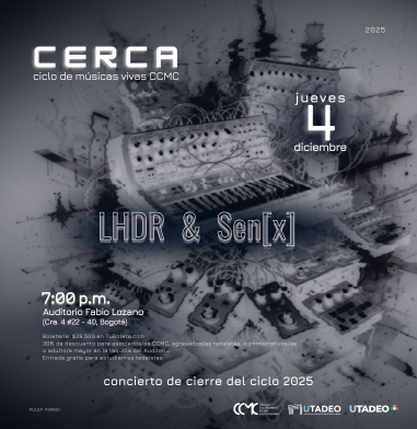 Jueves 4 de DiciembreLHDR & SEN(X)Pulep : KSR931Reseña:LHDR, fundada en 2023 por los músicos Hernán Guzmán y Juan David Guerrero, explora la relación entre sonido e imagen mediante improvisación, síntesis, modelado 3D y live coding, participando en espacios como Voltaje, Toplap y el Festival Imagen-Sonido; además, lanzó su primer disco con Bogotana Records dentro de la electrónica experimental. Sen(x) es un grupo de música experimental integrado por Paula Daniel Bogotá, Andrés Gómez y Julián Vega, enfocado en la creación con nuevas tecnologías e instrumentos electrónicos y acústicos.Repertorio:LHDRLHDR (2024)Hernán Darío Guzmán (Ibagué, 1996) y Juan David Guerrero (Bogotá, 1995)En los tiempos (2016)Daniel Leguizamón (Bogotá, 1979)I'm not here (2023)Jesús Buendía Puyo (Bogotá, 1996)Mudas hablan las flores al fondo del oído (2003)Ana María Romano (Bogotá, 1971)Sen(x)Improvisación libreHora: 7:00p.mEdad Mínima 5 añosDescuento 30% estudiantes, egresados tadeístas, o adulto mayor - Unicamente en la taquilla del Auditorio - miércoles a viernes de 12:00pm a 6:00pm -