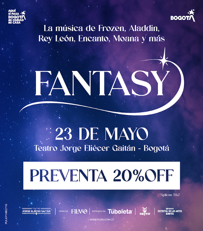 FILMO, una de las orquestas más innovadoras del formato sinfónico en vivo en Colombia, presenta FANTASY en Bogotá: un espectáculo en gran formato construido sobre la música de Frozen, Encanto, El Rey León y Coco, y más. FANTASY redefine lo que puede ser un concierto familiar: no solo entretenimiento, sino una experiencia sonora, visual y emocional en vivo, con invitados especiales, creada para que el público vuelva a sentir la fantasía en el pecho.