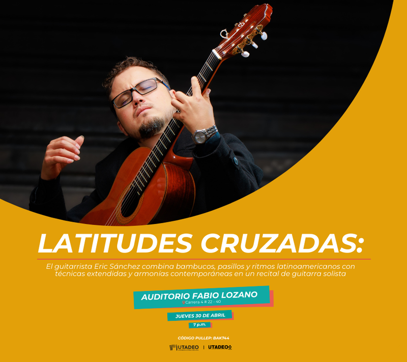 El Maestro Eric Sánchez renueva el repertorio de la guitarra de concierto al integrar aires tradicionales colombianos y latinoamericanos con armonías contemporáneas y técnicas extendidas. Su propuesta vincula sonidos ancestrales con una identidad actual, fundamentada en una sólida formación y trayectoria internacional. Mediante una interpretación que equilibra potencia y melodía, Sánchez establece un puente intercultural entre la música de raíz y las estéticas modernas para conectar con nuevos públicos. Este bloque celebra la identidad colombiana mediante el bambuco tradicional con "Popayán" y "El Sotareño", junto a la "Pequeña Suite" de Gustavo Niño que explora el torbellino y el pasillo. El cierre destaca la visión de Eric Sánchez, quien reinterpreta raíces del Pacífico como "Mi Buenaventura" y "Parió la Luna", fusionando la academia con el folclor nacional en una propuesta contemporánea y vibrante.Hora: 7:00pmEdad Mínima 5 añosDescuento 30% estudiantes, egresados tadeístas, o adulto mayor - Unicamente en la taquilla del Auditorio - miércoles a viernes de 12:00pm a 6:00pm -